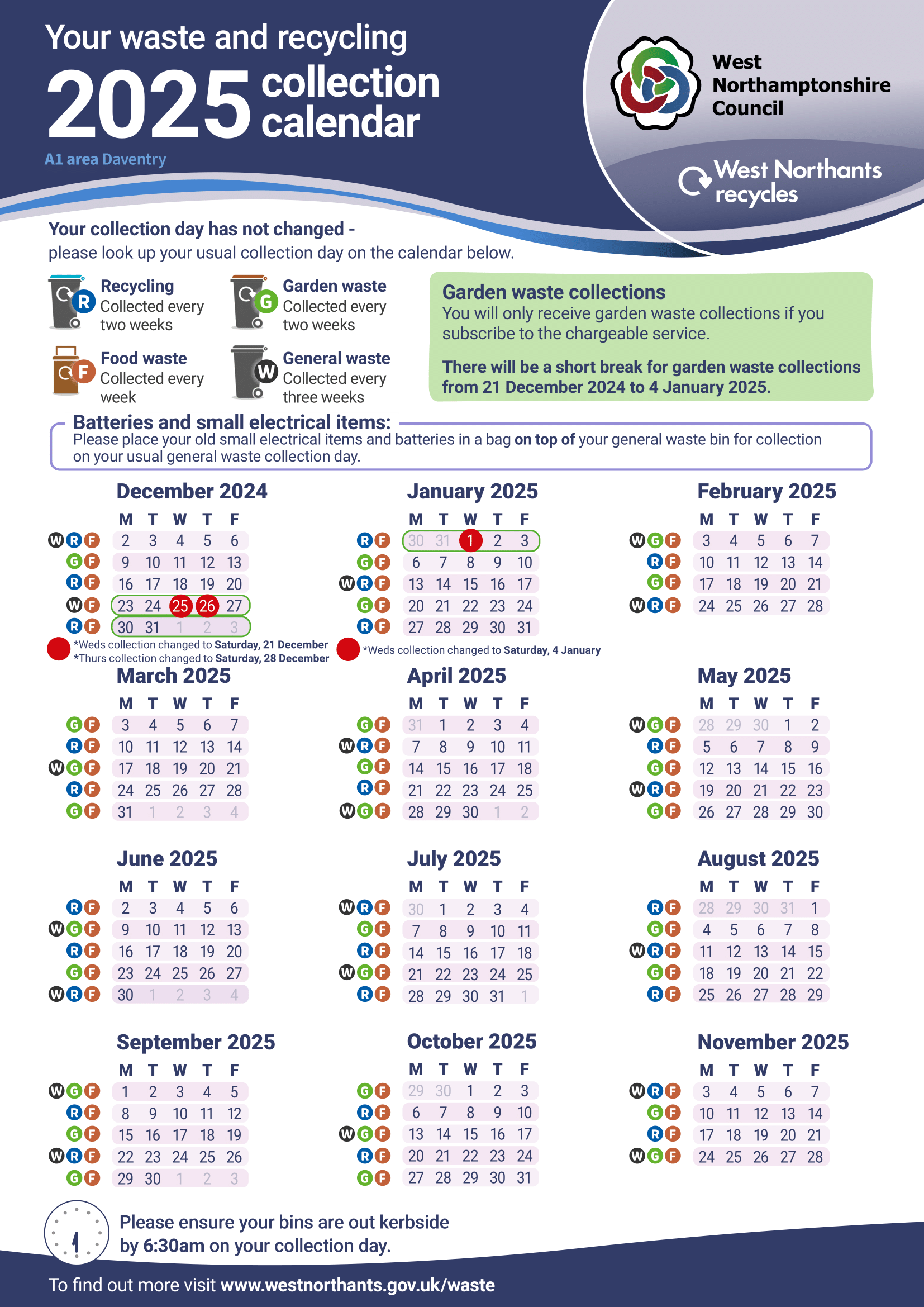 Bin Collection Woodford Halse Select the date for the collection 06 January 2025 13 January 2025 20 January 2025 27 January 2025 03 February 2025 10 February 2025 17 February 2025 24 February 2025 03 March 2025 10 March 2025 17 March 2025 24 March 2025 31 March 2025 07 April 2025 14 April 2025 21 April 2025 28 April 2025 05 May 2025 12 May 2025 19 May 2025 26 May 2025 02 June 2025 09 June 2025 16 June 2025 23 June 2025 30 June 2025 07 July 2025 14 July 2025 21 July 2025 28 July 2025 04 August 2025 11 August 2025 18 August 2025 25 August 2025 01 September 2025 08 September 2025 15 September 2025 22 September 2025 29 September 2025 06 October 2025 13 October 2025 20 October 2025 27 October 2025 03 November 2025 10 November 2025 17 November 2025 24 November 2025